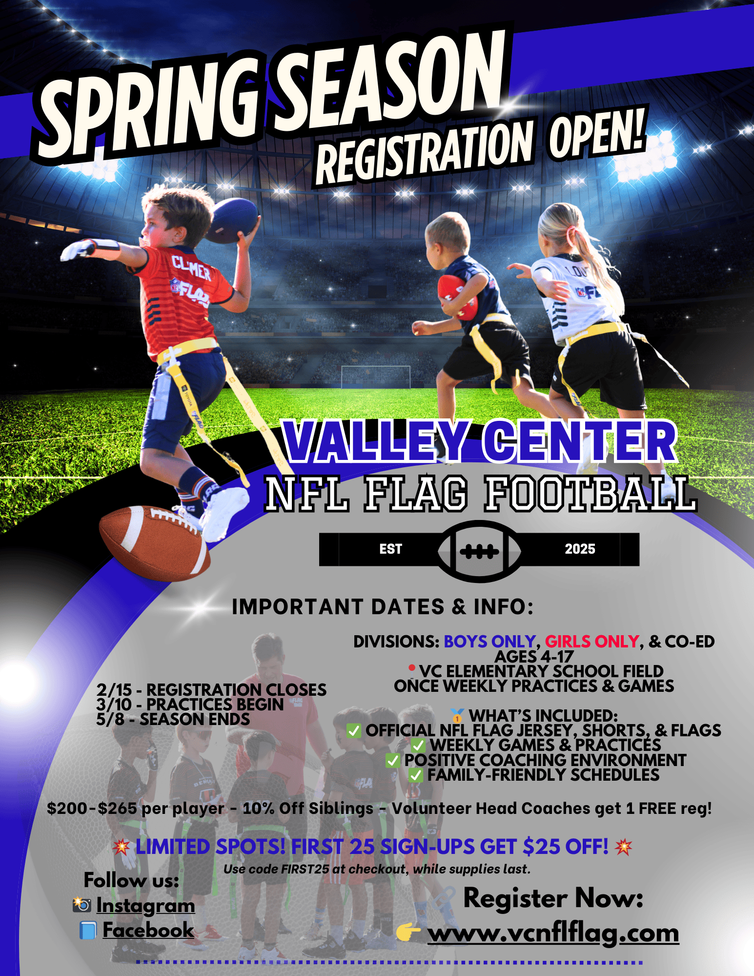 Join us for an exciting season of NFL FLAG Football in Valley Center! The Spring League runs