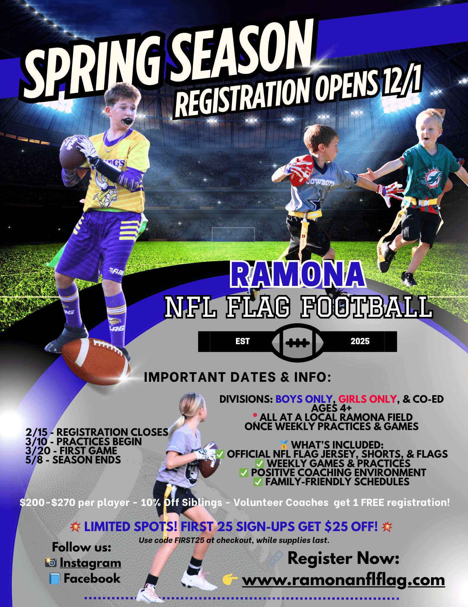 Join us for an exciting season of NFL FLAG Football in Ramona! The Spring League runs