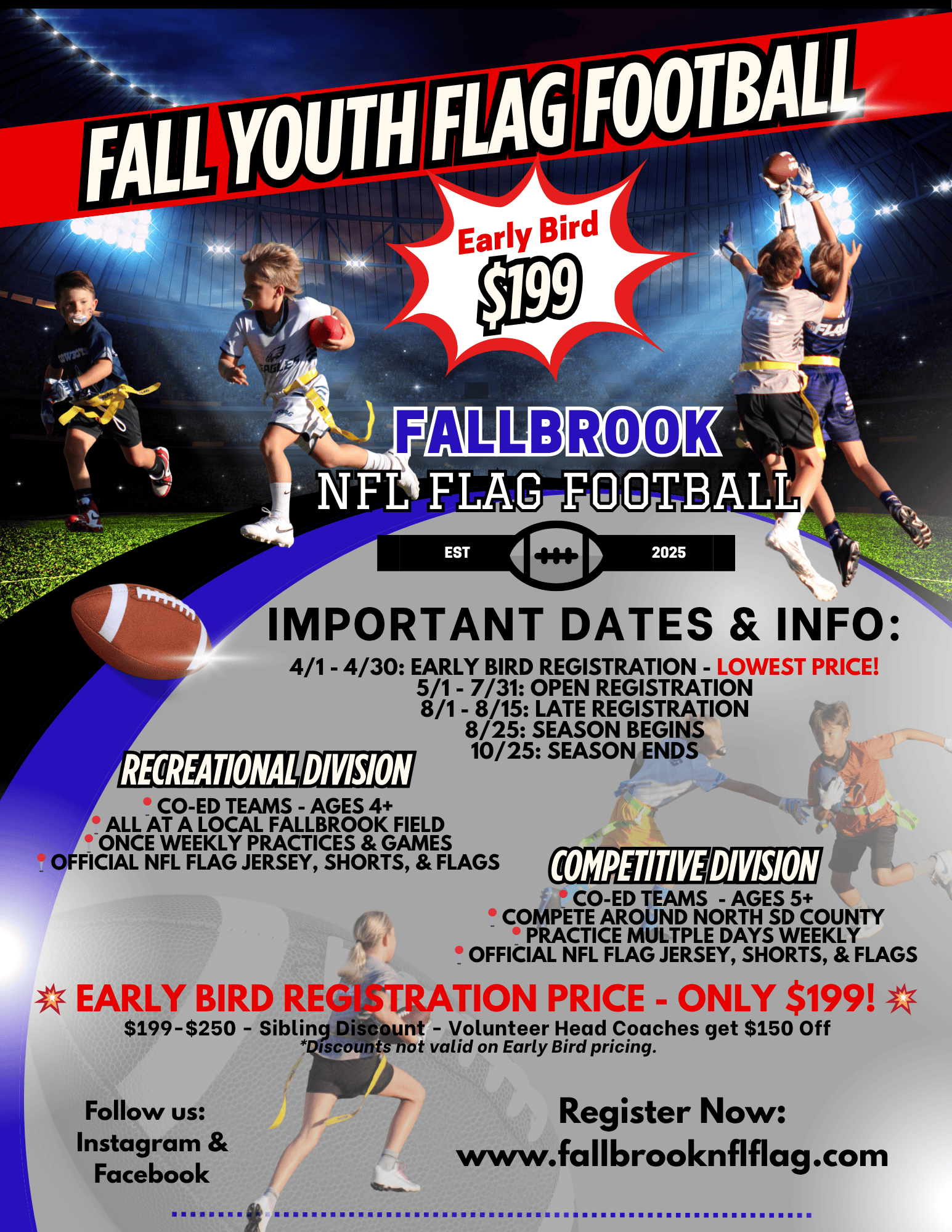 Join us for an exciting season of NFL FLAG Football in Fallbrook! The Fall Season runs